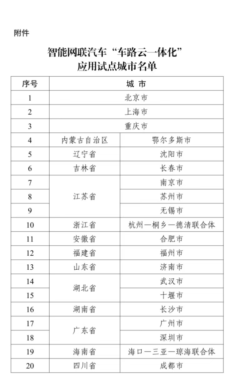 据工信部消息,按照《工业和信息化部 公安部 自然资源部 住房和城乡建设部 交通运输部关于开展智能网联汽车“车路云一体化”应用试点工作的通知》(工信部联通装〔2023〕268号)安排,在自愿申报、组织评估基础上,确定了20个城市(联合体)为智能网联汽车“车路云一体化”应用试点城市(名单详见附件)。