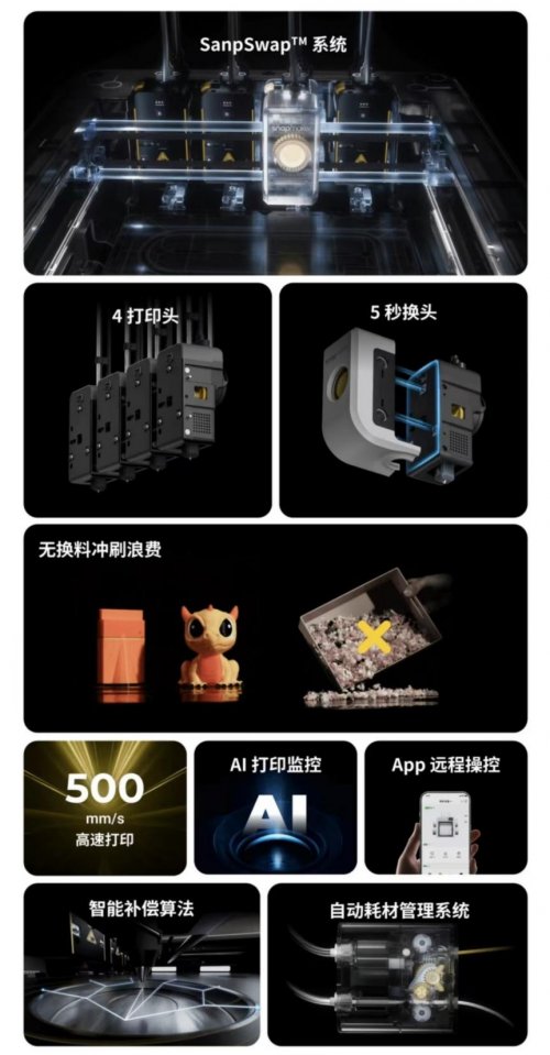 作为多色多头3D打印领域的革新力作,Snapmaker U1搭载SnapSwap™独立四头并联系统,通过5秒极速换头技术,有效解决了传统多色打印中效率低下、耗材浪费等行业痛点。其打印效率较传统方案提升5倍的同时,更可实现约80%的耗材节约,真正兼顾了高速生产与绿色环保。该设备还拥有270×270×270mm成型空间与500mm/s的打印速度,配合AI打印监控、APP远程操控、智能补偿算法、自动耗材管理系统,智能校准及自动床调平功能,大幅降低了多色打印的操作门槛,让高品质彩色模型制作变得简单高效。
